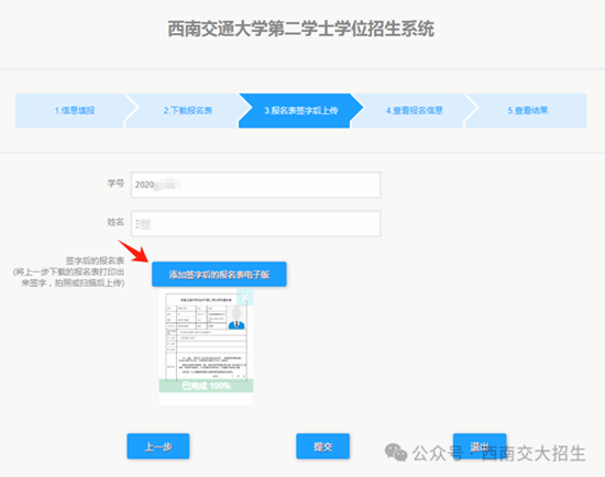 上传报名表:《william威廉中文2024年第二学士学位报名表》在承诺人处签字后,拍照或扫描为清晰照片,点击“添加签字后的报名表电子版”进行上传,上传成功后点击“提交”完成报名。