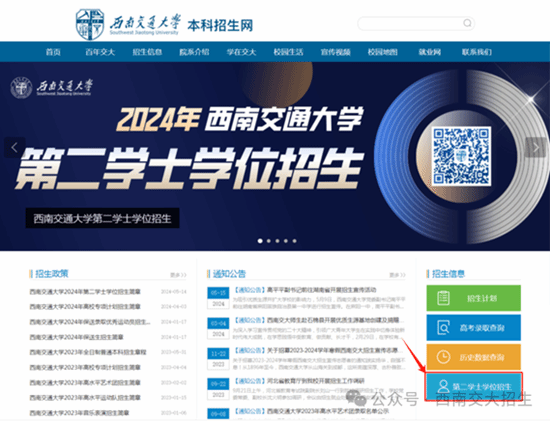 https://zhaosheng.swjtu.edu.cn/,点击“第二学士学位招生”进入报名系统;或直接访问https://cjcx.swjtu.edu.cn/exw/进入报名系统。