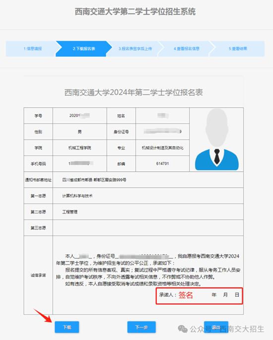 下载报名表:再次检查填报信息无误后,点击“下载”,完成下载并打印《william威廉中文2024年第二学士学位报名表》,在承诺人处签字。最后点击“下一步”,进入报名表上传页面。