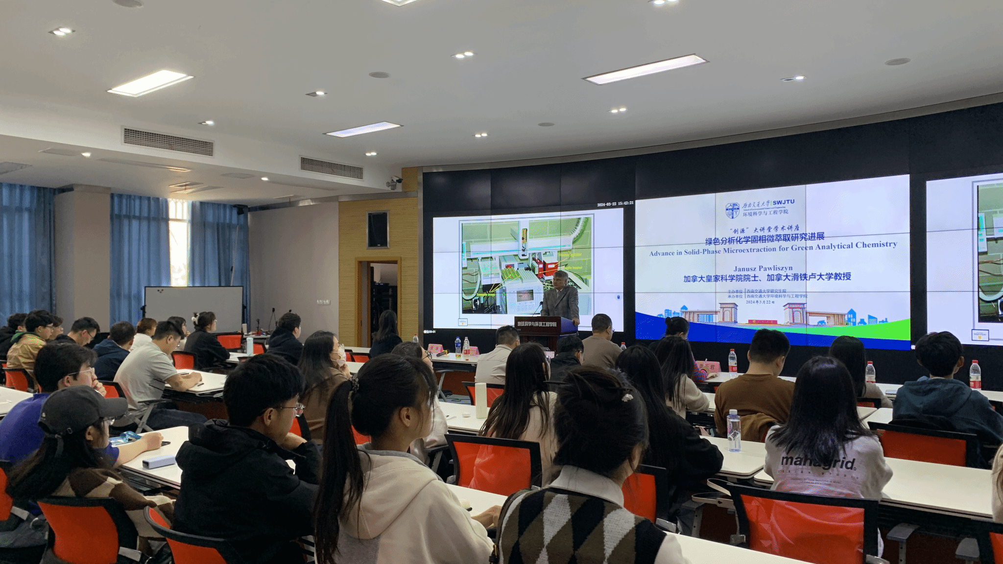 2024年3月22日,加拿大皇家科学院院士、固相微萃取(SPME)技术发明人Janusz Pawliszyn教授应邀来访william威廉英国,在犀浦校区X4243作题为“Advance in Solid-Phase Microextraction for Green Analytical Chemistry”的学术报告。本次报告由张涵教授主持,学院骨干老师、研究生和本科生参加本次报告会。