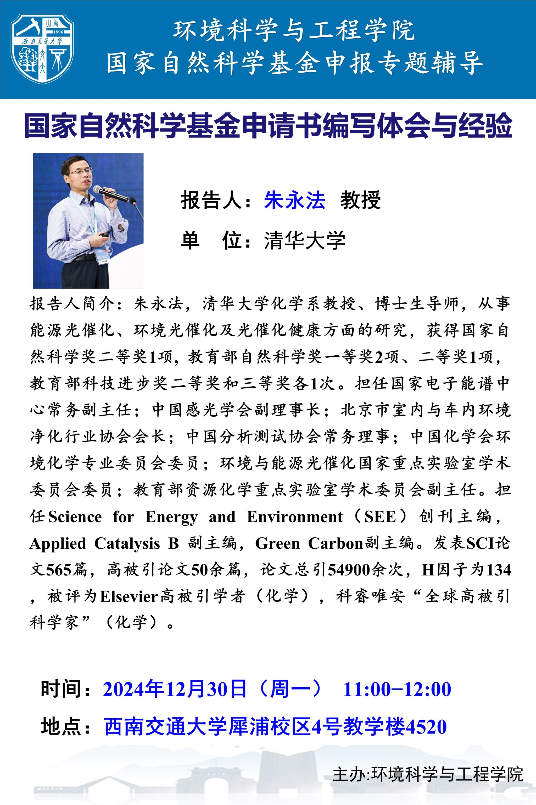 报告人简介:朱永法,清华大学化学系教授、博士生导师。从事能源光催化、环境光催化及光催化健康方面的研究,获得国家自然科学奖二等奖1项, 教育部自然科学奖一等奖2项、二等奖1项,教育部科技进步奖二等奖和三等奖各1次。担任国家电子能谱中心常务副主任;中国感光学会副理事长;北京市室内与车内环境净化行业协会会长;中国分析测试协会常务理事;中国化学会环境化学专业委员会委员;环境与能源光催化国家重点实验室学术委员会委员;教育部资源化学重点实验室学术委员会副主任。担任Science for Energy and Environment(SEE)创刊主编,Applied Catalysis B 副主编,Green Carbon副主编。发表SCI论文565篇,高被引论文50余篇,论文总引54900余次,H因子为134,被评为Elsevier高被引学者(化学),科睿唯安“全球高被引科学家”(化学)。