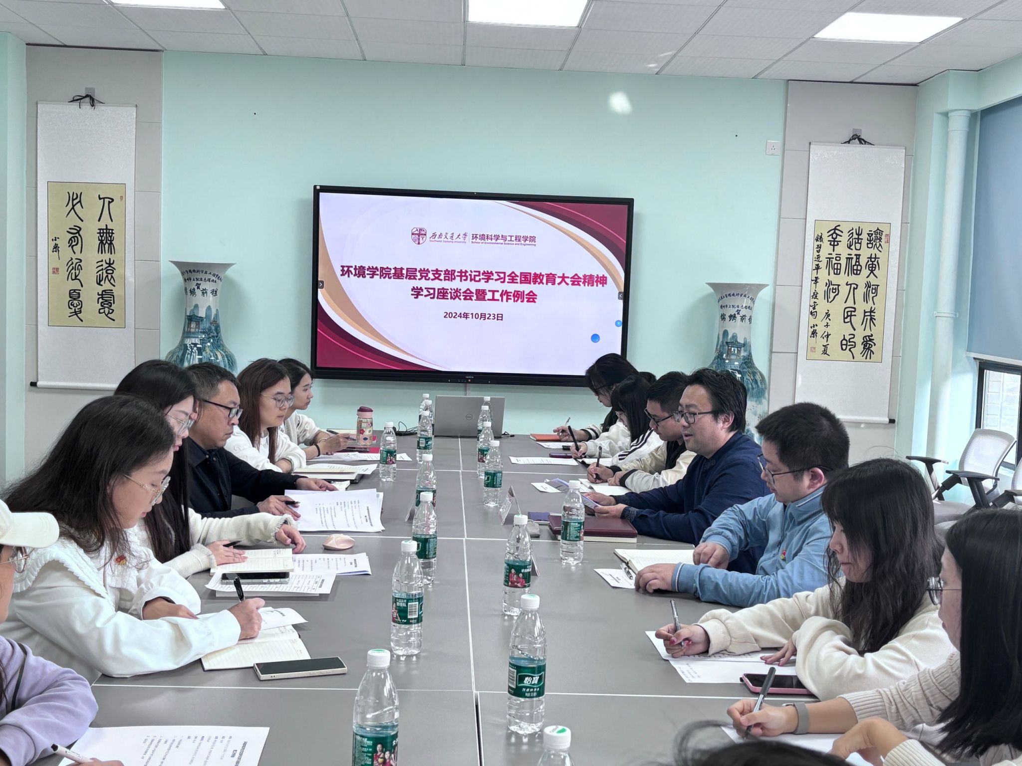 2024年10月23日下午,为深入贯彻落实习近平新时代中国特色社会主义思想,全面提升学生党支部组织力,强化党支部政治功能,充分发挥党支部战斗堡垒作用,环境学院在X4348会议室召开了基层党支部书记学习全国教育大会精神座谈会暨党支部书记例会(扩大)会议。学院党委书记甘霖、党委副书记胡安辉、组织员宋海涛、辅导员黄泳桦以及学院各党支部书记、支委参加了此次会议。会议由辅导员黄泳桦主持。