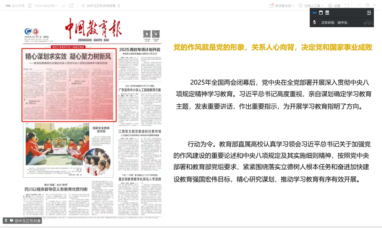 最后,田中玉同志以“精心谋划求实效,凝心聚力树新风”为主题展开领学,带领支部党员原原本本学习了教育部直属高校全面启动深入贯彻中央八项规定精神学习教育综述。加强作风建设要发挥好“头雁效应”。习近平总书记强调:"改进作风必须自上而下、以上率下。”支部党员纷纷表示应当发挥党员的带头作用,进一步丰富党支部建设内涵,推动学习教育入脑入心。