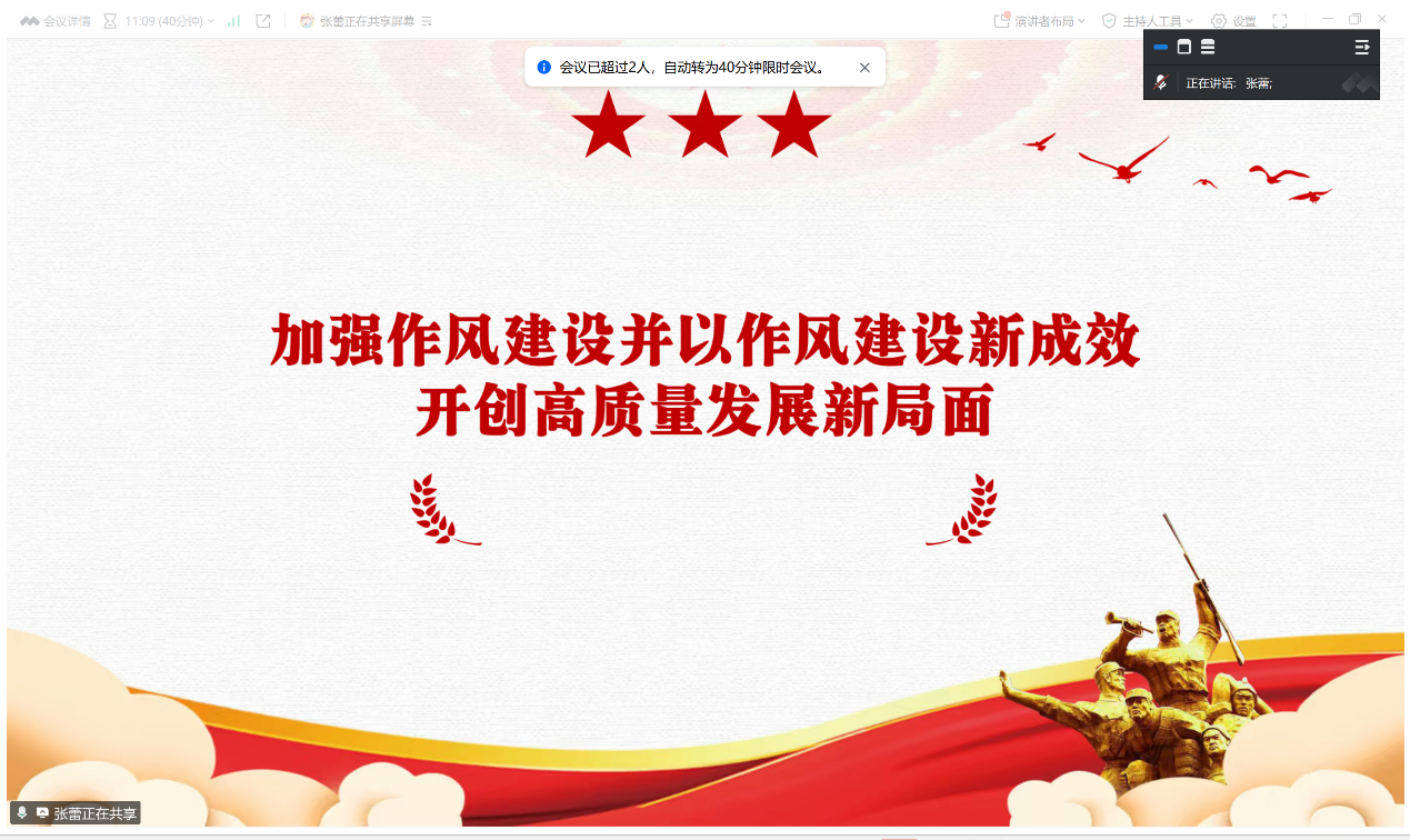 接着,张蕾同志以“加强作风建设并以作风建设新成效开创高质量发展新局面”为主题展开领学,带领支部党员认真学习了习近平总书记关于加强党的作风建设的重要论述,深刻阐述了加强党的作风建设的重大举措、重点任务和“关键少数”。