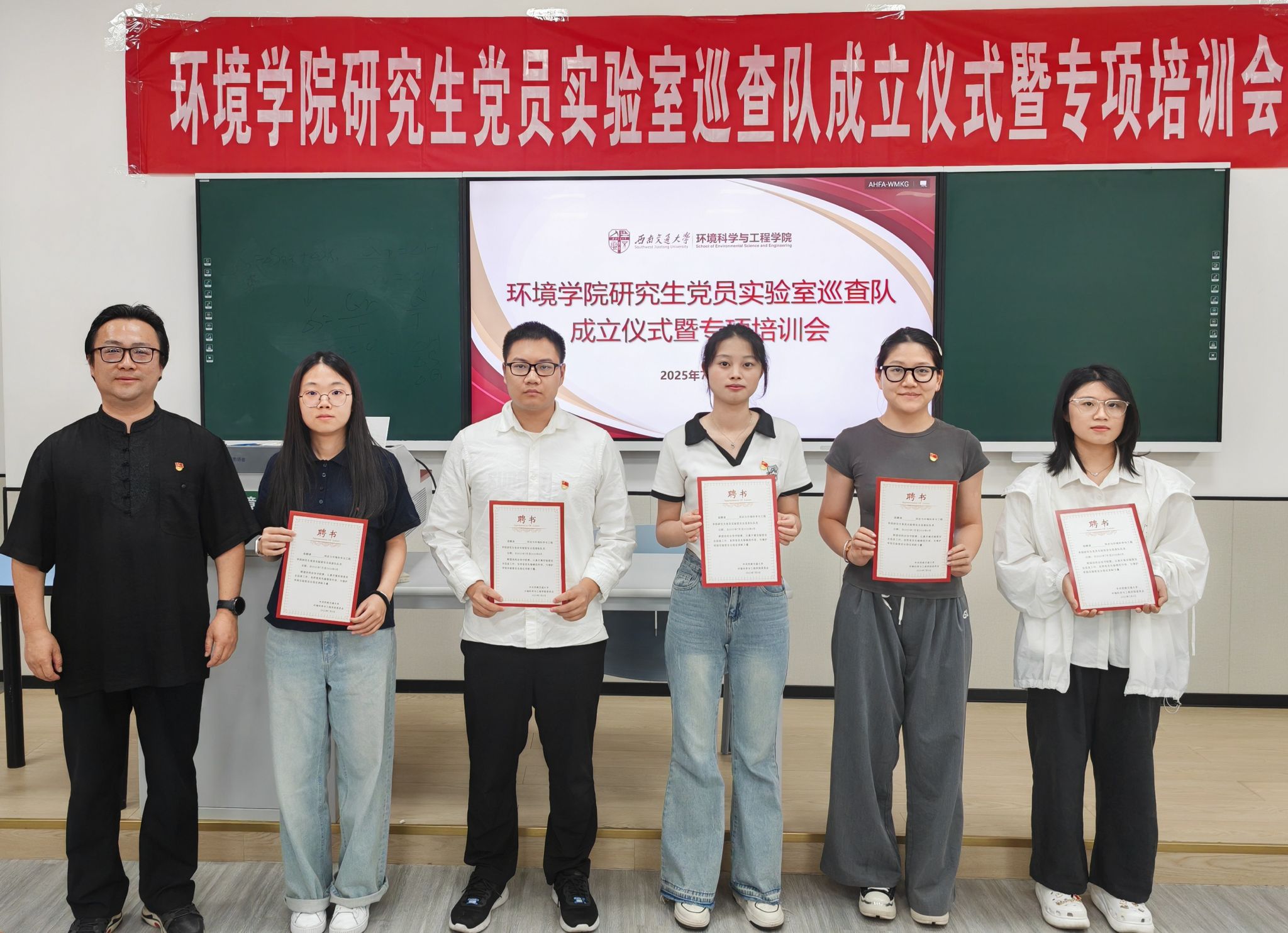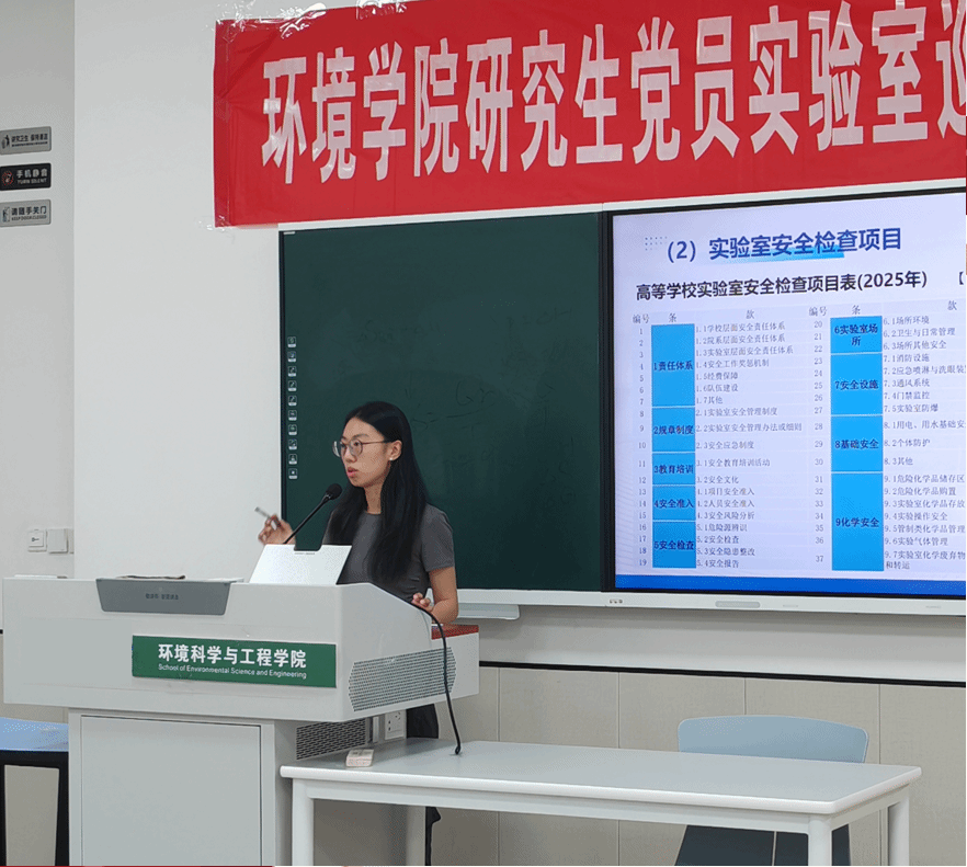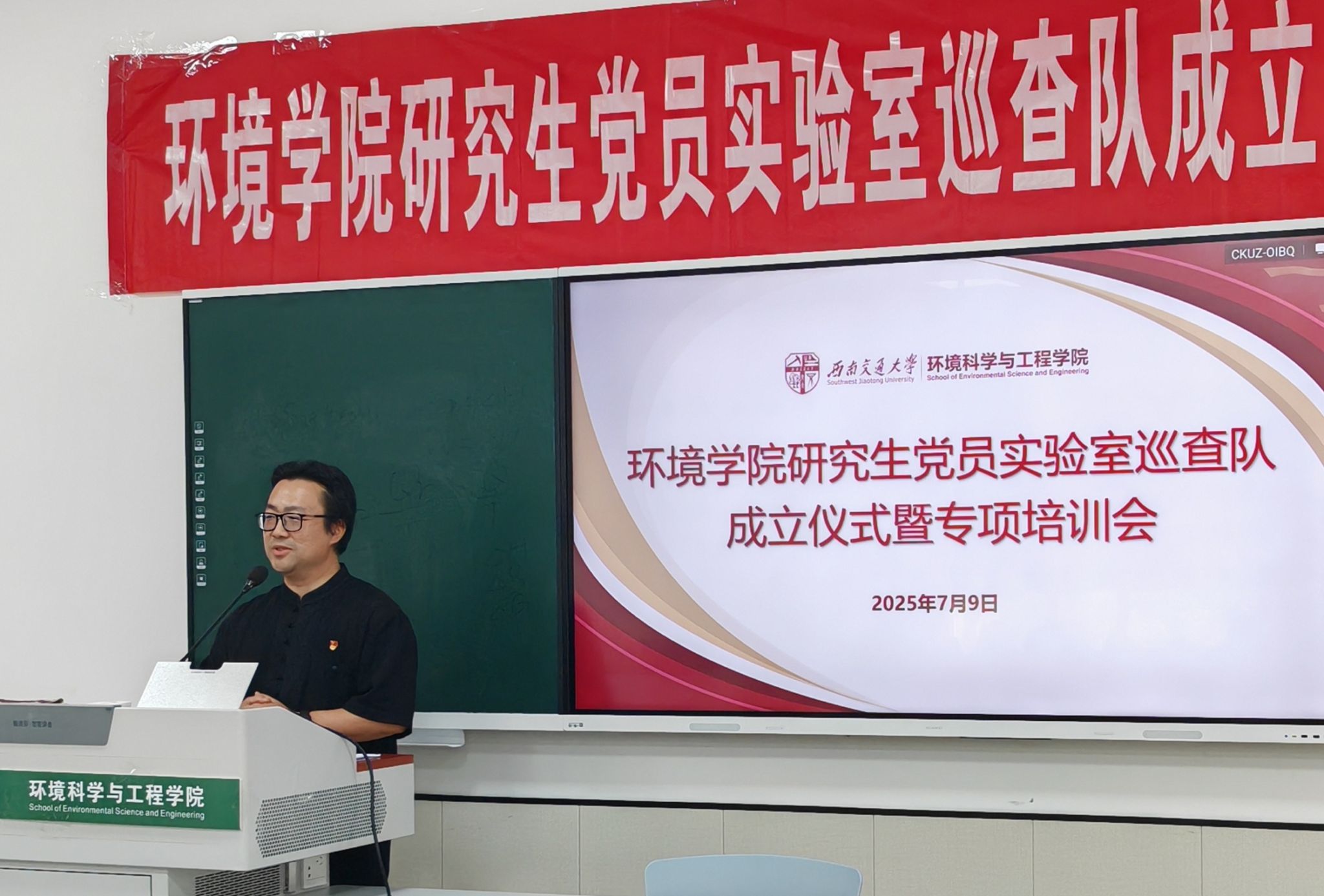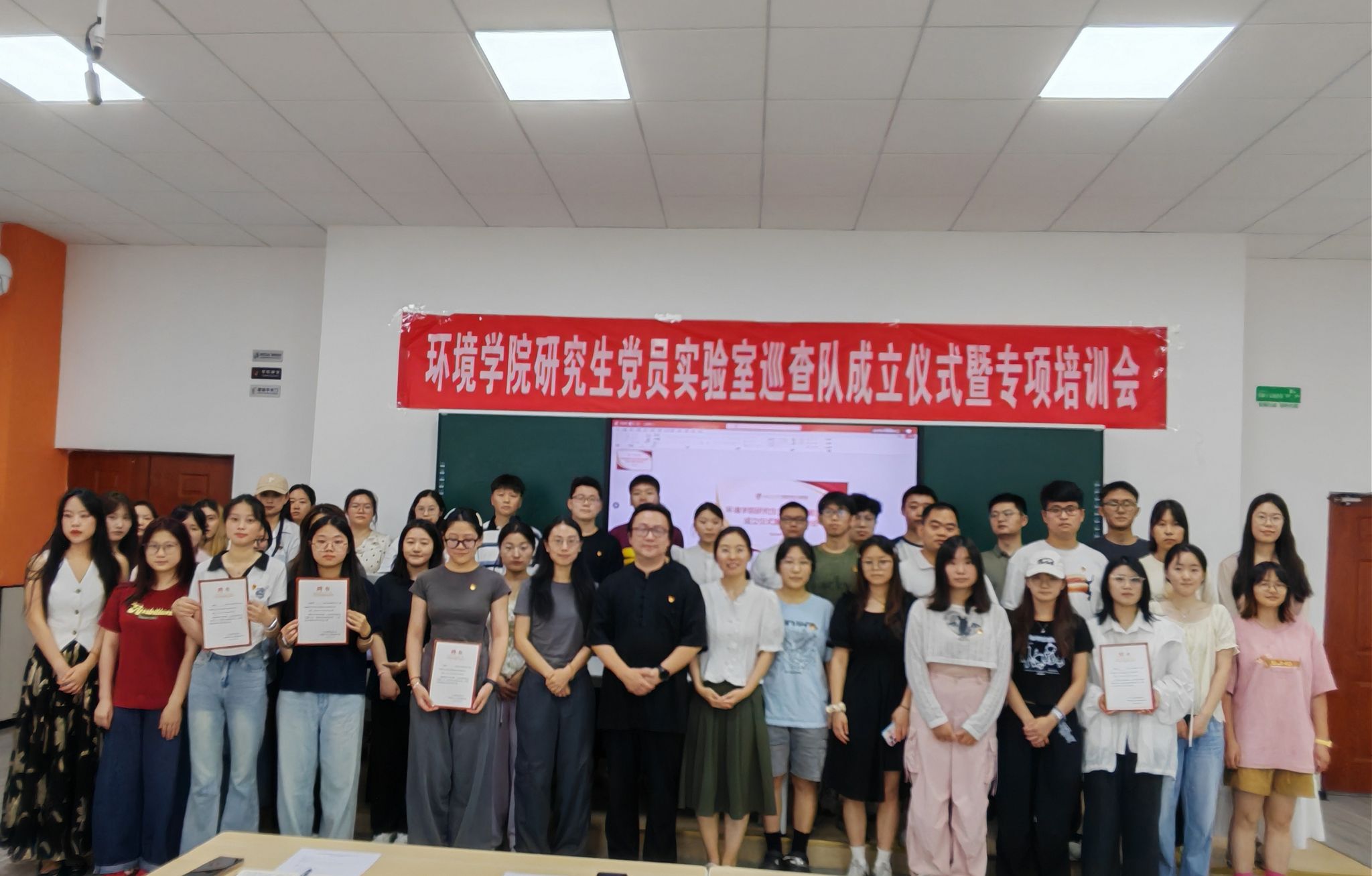 为充分发挥研究生党员在学院实验室安全管理工作中的先锋模范作用,筑牢实验室安全防线,2025年7月9日周三下午,环境学院研究生党员实验室安全巡查队成立仪式暨专项培训会在X4247举行,学院党委书记甘霖、学院团委书记翟琦、实验中心唐玥、辅导员黄泳桦以及巡查队全体成员参加。