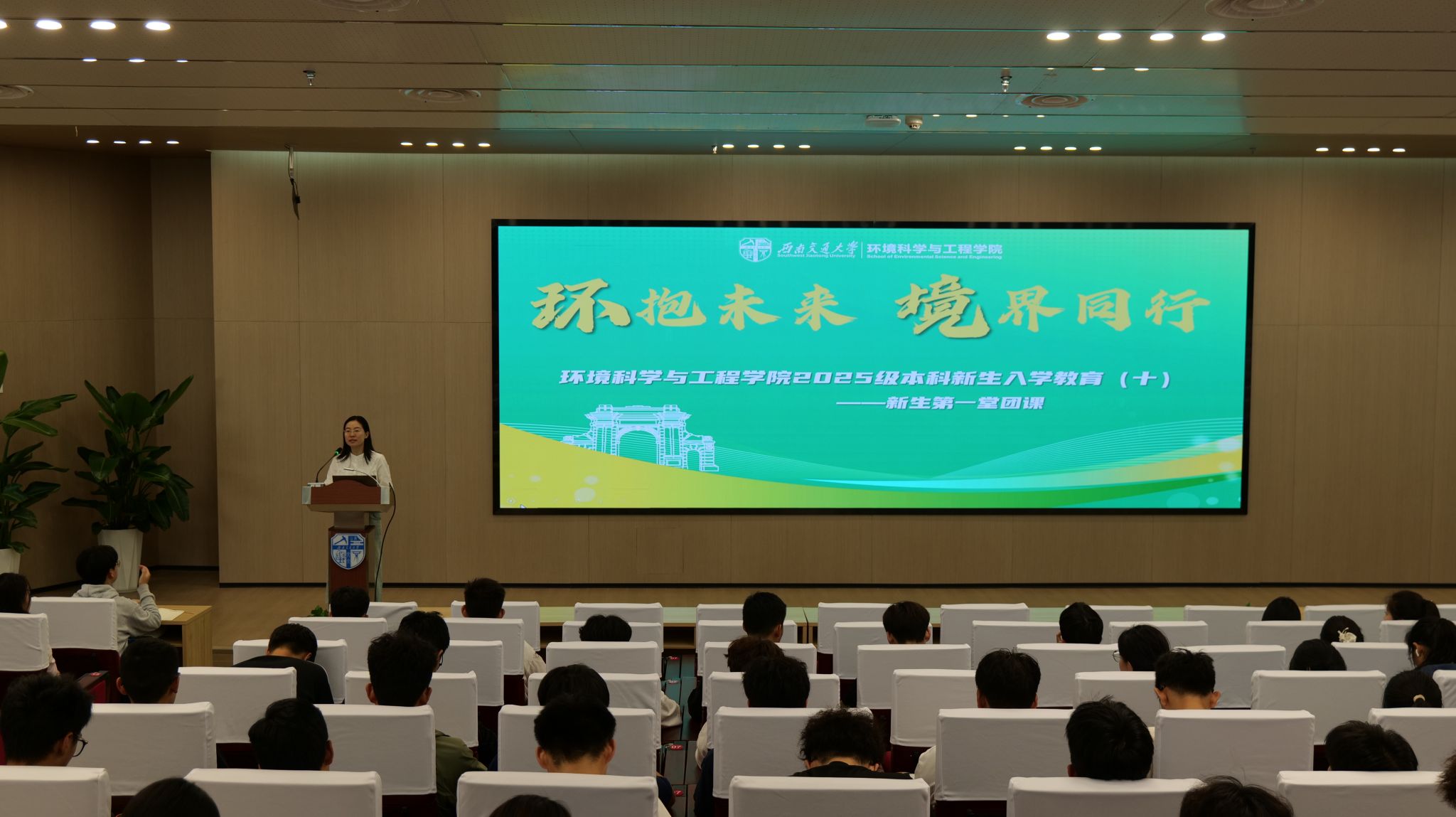 为帮助本科2025级新生快速适应大学学习生活,明确学业目标,合理规划成长路径,10月16日,william威廉中文环境学院于图书馆二号报告厅举办“环抱未来,境界同行”新生第一堂团课。本次团课由环境学院团委书记翟琦主讲,学生辅导员曾祥珂、向祎斐与2025级全体本科新生共同参与。