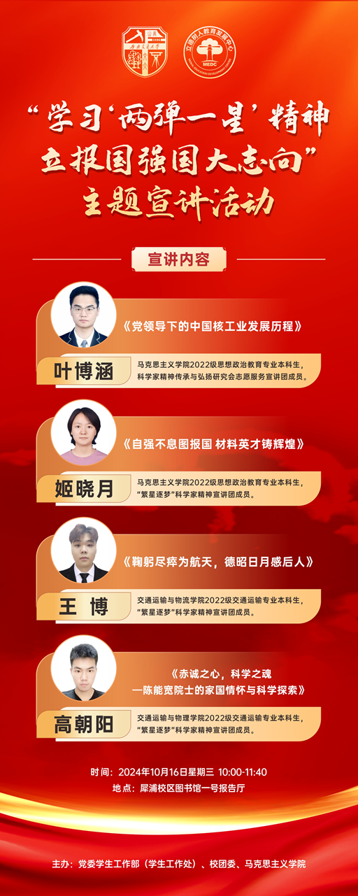 为深入学习贯彻习近平新时代中国特色社会主义思想和党的二十届三中全会精神,加强大学生爱国主义、科学精神教育,进一步弘扬“两弹一星”精神和科学家精神,在我国第一颗原子弹爆炸成功60周年之际,学校拟开展“学习‘两弹一星’精神,立报国强国大志向”主题宣讲活动,现将有关事项通知如下。